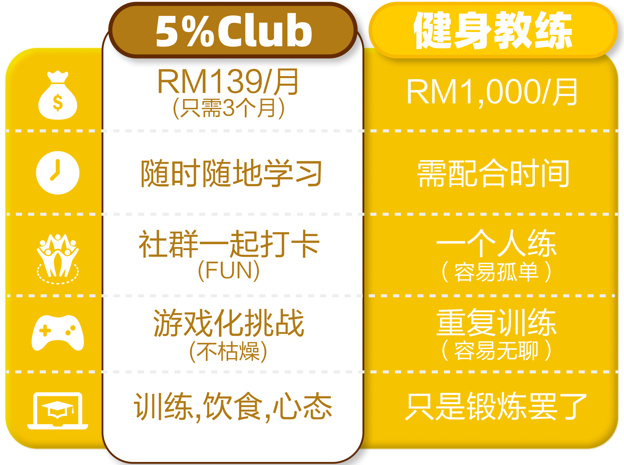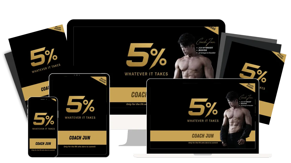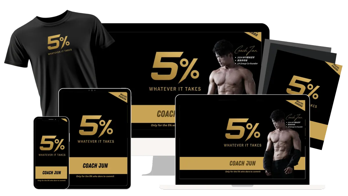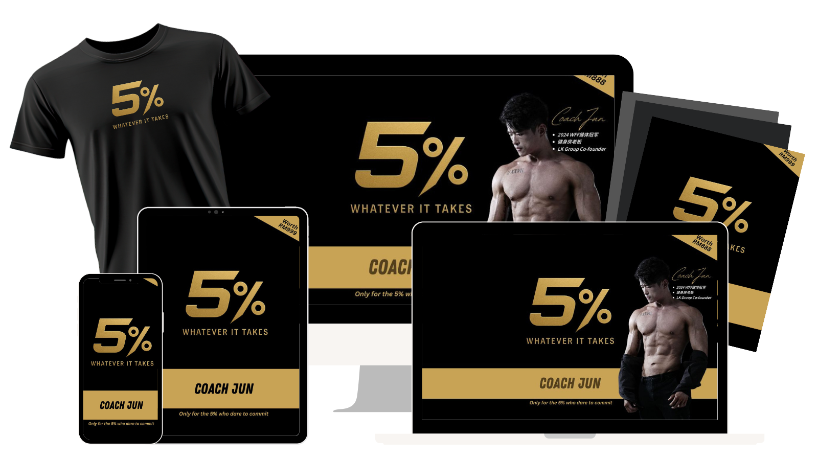 Coach Jun创立的 5%【玩Game打卡式】线上减脂Program 主要就是建立在 好玩,并且简单易懂的宗旨上,让大家可以在享受生活的途中,也可以稳稳瘦下来。